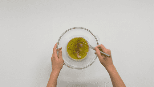 In a bowl, mix olive oil, lemon juice, crushed garlic, salt, pepper, and sugar until smooth.