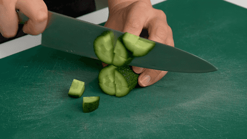 Chop red onion and cucumbers into small cubes.