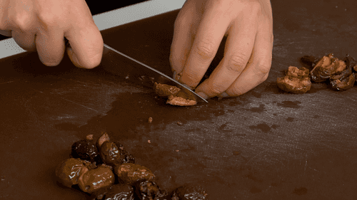 Remove the pits from the olives and chop them coarsely.