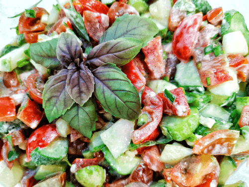 Summer vegetable salad with basil and tkemali