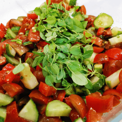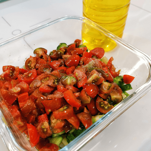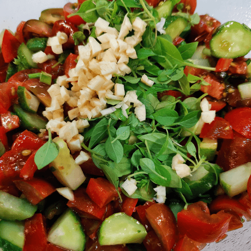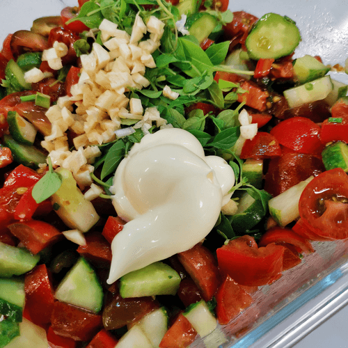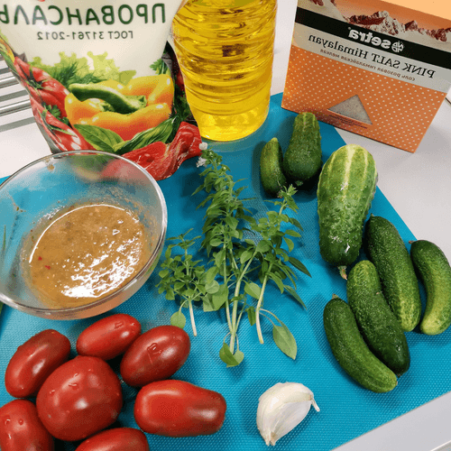Summer vegetable salad with basil and tkhemali is a bright representative of Georgian cuisine, where freshness and rich flavor always play a key role. Tkhemali, an aromatic sour sauce made from plum, adds spiciness and a slight tartness to the salad, perfectly complementing the juiciness of cucumbers and the sweetness of cherry tomatoes. Basil adds subtle spicy notes while garlic provides a mild sharpness. Oil and mayonnaise create a delicate texture and harmoniously bind the ingredients together. This salad is ideal for hot summer days—it's light, refreshing, and simultaneously rich. It can be served as a standalone dish or as an accompaniment to meat and fish; it pairs excellently with Georgian wines. This salad is a celebration of flavors—a balance between freshness and richness, tradition and originality.