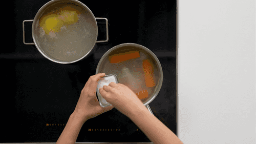 In another saucepan, bring water to a boil and carefully add the eggs. Boil for 11 minutes. Pour cold water over the cooked eggs to cool them.