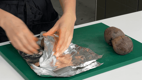 Wash the beetroot, wrap it in foil, and bake in a preheated oven at 200 degrees. A small beet takes about 45 minutes to bake.