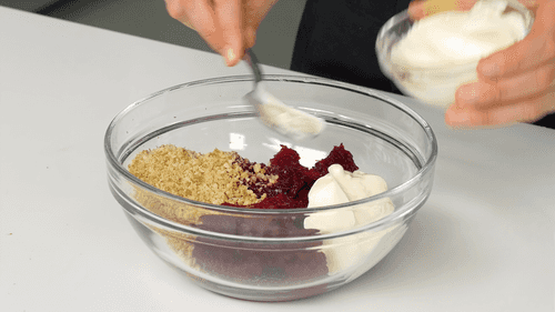 Grind walnuts in a blender and mix with grated beetroot and a spoon of mayonnaise.