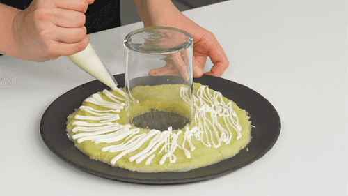 To make the 'Pomegranate Bracelet' salad, place an inverted cylindrical glass in the center of a flat plate. Arrange grated potatoes around the glass and spread mayonnaise on the first layer.
