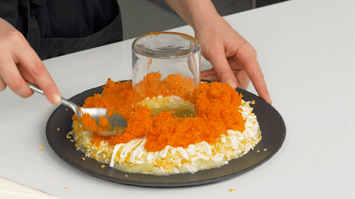 Layer grated carrots over the eggs, remembering to spread mayonnaise on each layer.