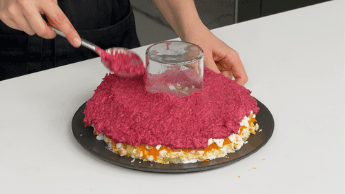 The most important layer in the salad is the beetroot. The beetroot should cover all layers for an even color in the finished salad. Spread with mayonnaise and refrigerate for 2 hours.