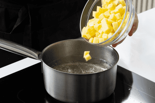 Pour white wine over peeled and chopped boiled potatoes and let it sit for 10-15 minutes.