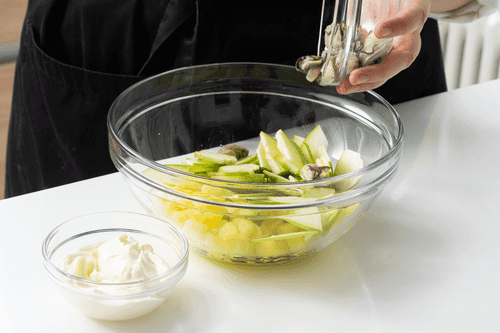 Before serving, mix potatoes, oysters, and apple slices with mayonnaise and place in a salad bowl.