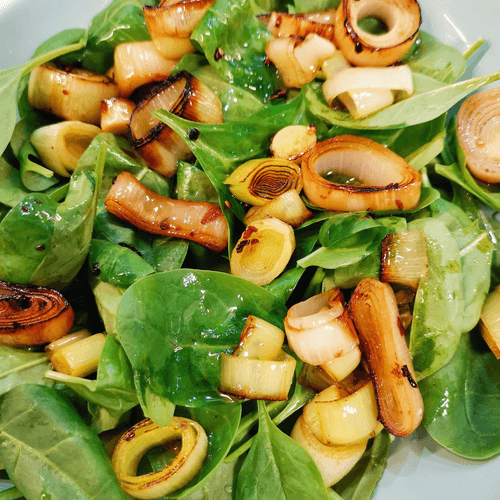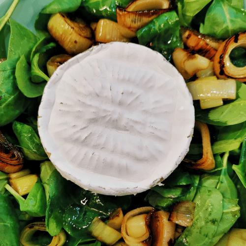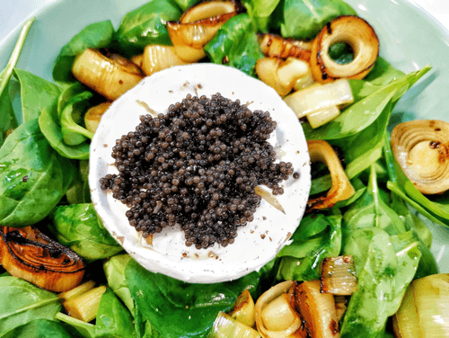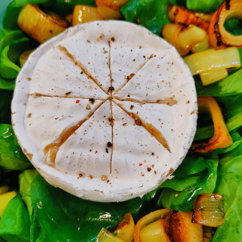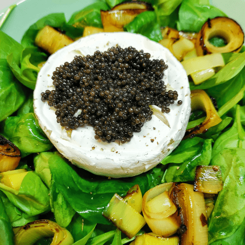 Салат с запеченным камамбером и черной икрой — изысканное блюдо французской кухни, сочетающее нежность плавленого сыра с пикантностью черной икры. Камамбер, запеченный до мягкости, раскрывает глубокие сливочные нотки, гармонично дополняемые карамелизированным луком-пореем и свежестью шпината. Белое вино придает соусу тонкую кислинку, подчеркивая многослойность вкуса. Икра — символ утонченности — завершает композицию элегантным солоноватым акцентом. Этот салат идеально подходит для торжественных ужинов или романтических вечеров, где важен не только вкус, но и эстетика подачи.