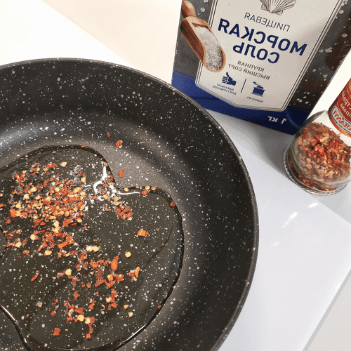 Heat oil in a pan with a pinch of sea salt and chili flakes.
