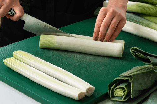 Separate the white part of the leek (the green part is not needed, put it in the fridge — it can be added to soup later), cut it in half and rinse thoroughly.