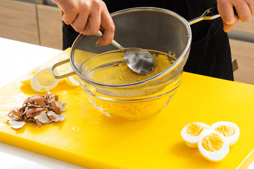Boil the eggs hard, peel them, separate the yolks from the whites and sieve the yolks. Chop the whites finely.