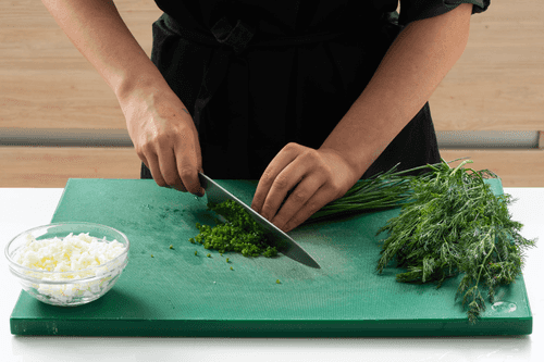 Finely chop the dill (only the tender sprigs) and also finely chop the green onion.