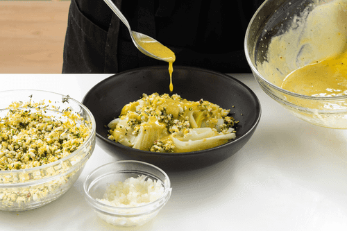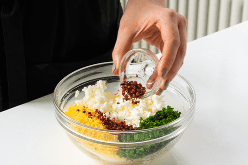 Mix the egg whites, yolks, greens, and pink pepper.