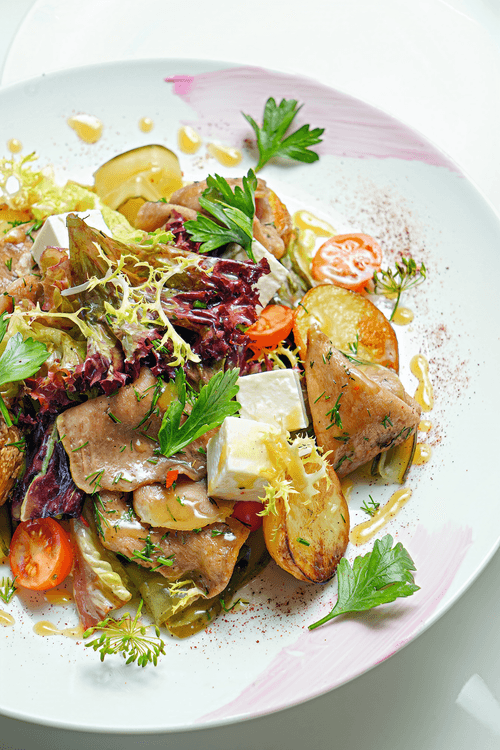 Warm salad with tongue and feta cheese