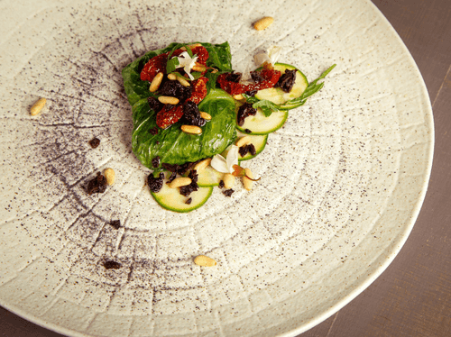Assemble the dish: layer zucchini at the bottom, then a wrap of salad, and garnish with olives, pine nuts, sun-dried tomatoes, and herbs.