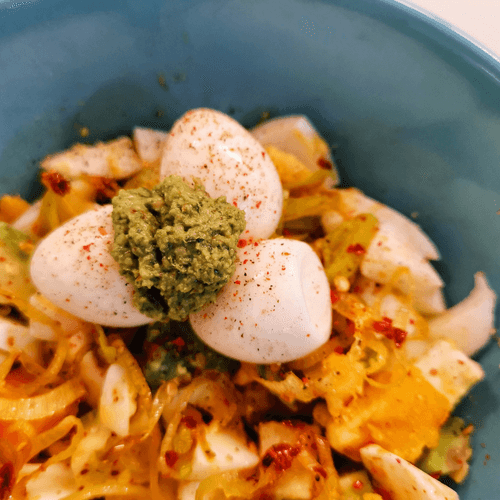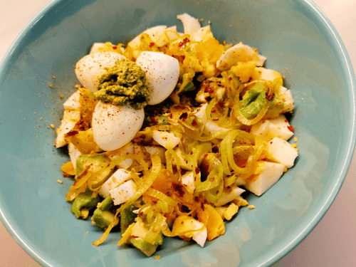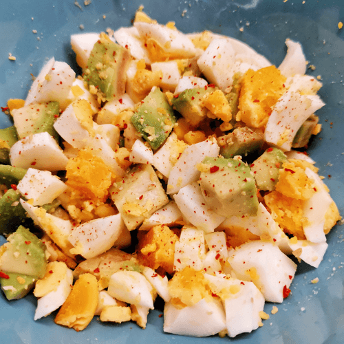 Dice the chicken eggs and combine with avocado. Season with salt and red pepper.