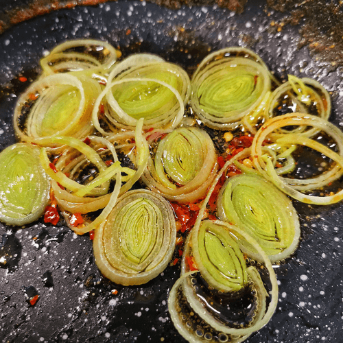 Slice the leek into thin rings and sauté in a hot pan with oil and a pinch of chili flakes until golden brown.