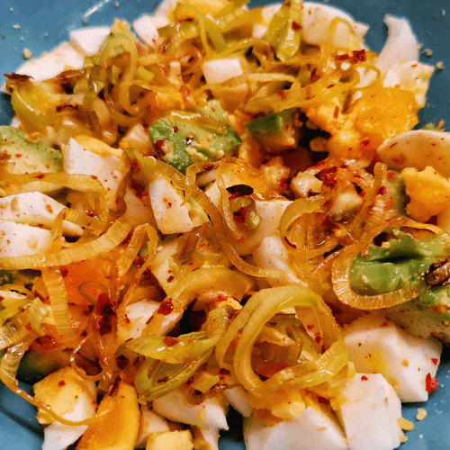 Onion salad with eggs and avocado is an exquisite dish of French cuisine that combines tenderness and spiciness. Its roots trace back to Mediterranean gastronomy traditions, where fresh vegetables and sauces turn simple ingredients into culinary masterpieces. Crispy golden rings of leek add a warm, caramelized aroma to the dish, while creamy avocado brings tenderness and a light nutty note. Eggs—both chicken and quail—provide heartiness and texture harmony. A vibrant accent is the pesto sauce, adding a rich herbal flavor. This salad is perfect as a standalone dish, a complement to meat, or a light dinner. It features softness, sharpness, and freshness, creating a gastronomic symphony in every forkful.