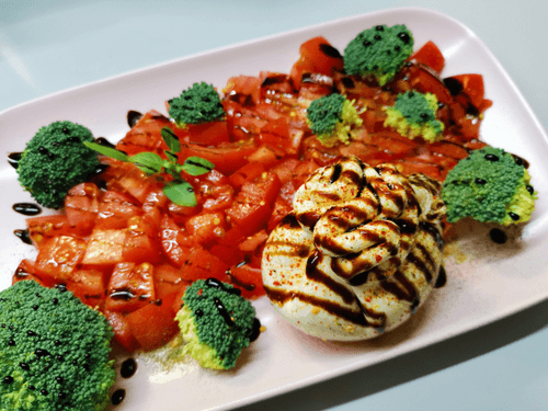 Tomato and broccoli salad with burrata is a harmonious blend of fresh vegetables and the creaminess of cheese. Inspired by Italian cuisine, it combines classic Mediterranean flavors. Sweet, juicy tomatoes add brightness to the dish, broccoli provides a light crunchy texture, and burrata envelops it in softness. Dressed with balsamic cream, the salad gains subtle caramel and tangy notes. It's the perfect dish for a summer lunch or light dinner that can be served as an appetizer or as a side to a main course. The simplicity of preparation makes it accessible even for culinary beginners. Enjoy the Italian flavor in every bite!