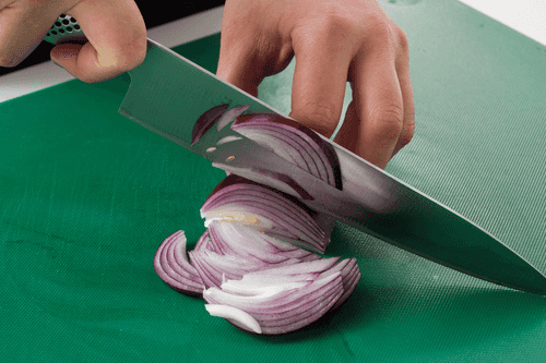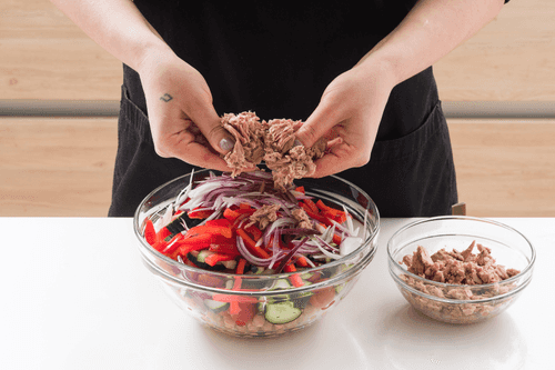 Slice the red onion into thin strips, soak it in cold water, and let it sit while preparing the salad (this will preserve its flavor but reduce some sharpness).