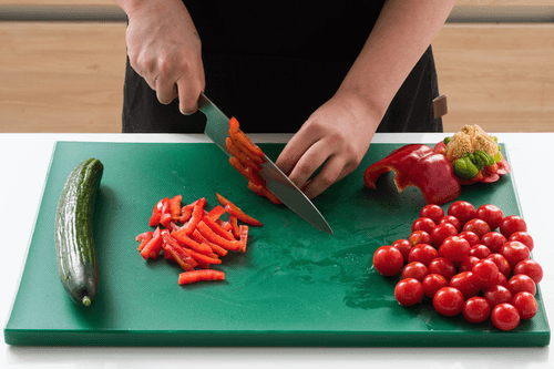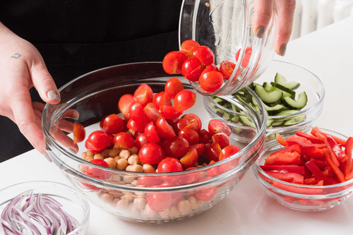 Cut cherry tomatoes in half. Remove seeds from cucumber and slice into half-moons. Remove the core from the pepper and cut into short thick strips.