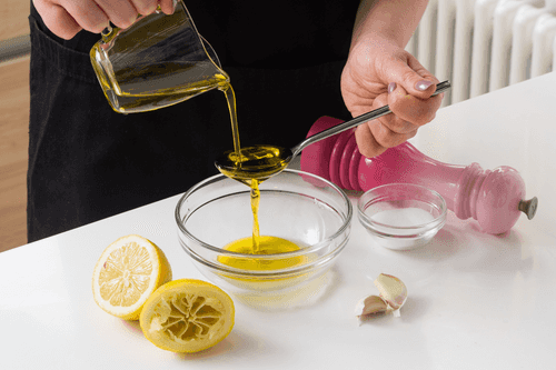 In a small bowl, mix lemon juice, olive oil, pressed garlic, salt, and pepper.