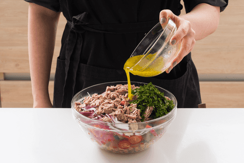 Dress the salad with dressing, season with salt and pepper to taste, and mix.