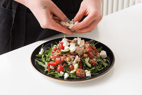 Place some arugula on a plate, add the salad on top, and sprinkle with feta cheese. Alternatively, you can serve the salad in a shared dish by mixing it with arugula and feta.
