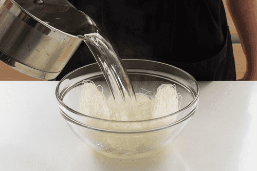 Soak the vermicelli in boiling water for 4 minutes. Drain the water, rinse the vermicelli with cold water, and transfer it to a deep container.