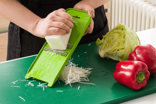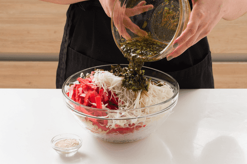 Grate the daikon into thin strips. Cut the iceberg and bell pepper into thin strips.