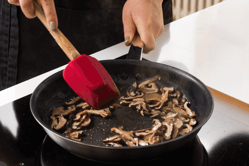First boil the shiitake, then slice and fry in vegetable oil until cooked.