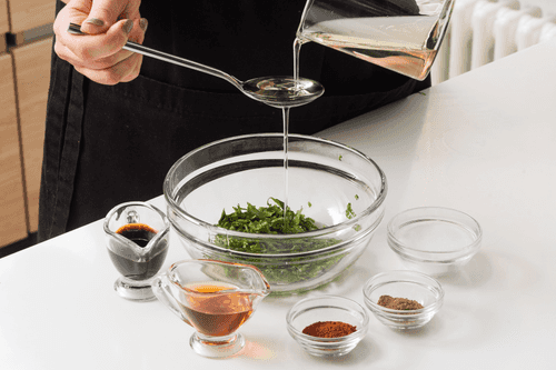 Finely chop the cilantro leaves, add sesame oil, soy sauce, red pepper, coriander, garlic pressed through a press, and mix everything well with a tablespoon of vegetable oil.