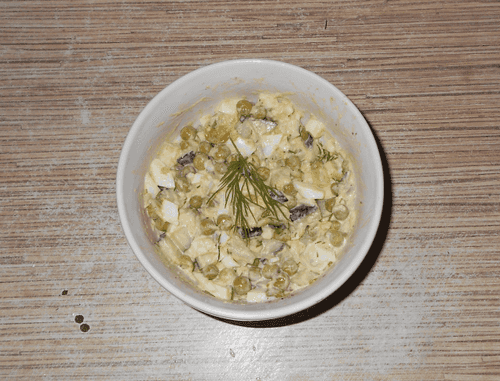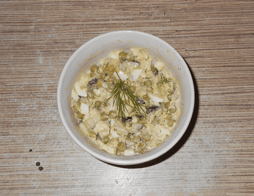 Salad with green peas and chicken is a light and nutritious dish from European cuisine. Its roots can be traced back to traditional family recipes where simple yet hearty ingredients combined to create a harmonious flavor. Tender boiled chicken paired with crunchy fresh cucumber and soft canned peas gives the salad a refreshing and balanced taste. Boiled eggs add richness, while fragrant dill enhances the freshness of the dish. Dressed with sour cream, the salad acquires a light creamy texture, and salt and pepper complete the flavor composition. This salad is perfect as a standalone dish or side dish; it can be served at festive tables or used as a nutritious snack. The simplicity of preparation makes it an excellent choice for a quick yet delicious lunch.