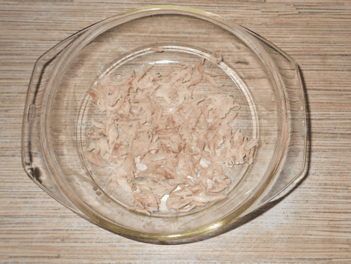 Take the chicken and separate the meat from the bones and skin, placing it in a bowl.