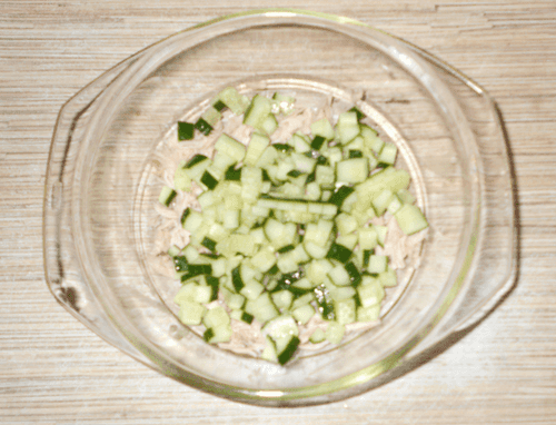 Wash and chop the cucumber into small cubes, and place it next to the chicken.