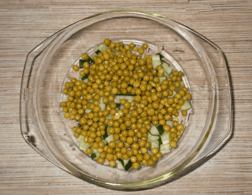 Drain the liquid from the can of peas, add it to the bowl with chicken and cucumber.