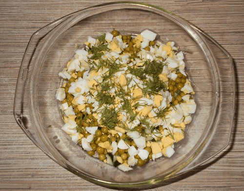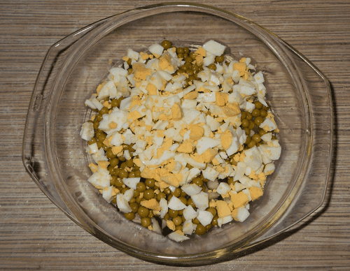 Peel the boiled eggs, chop them coarsely, and add to the other ingredients.