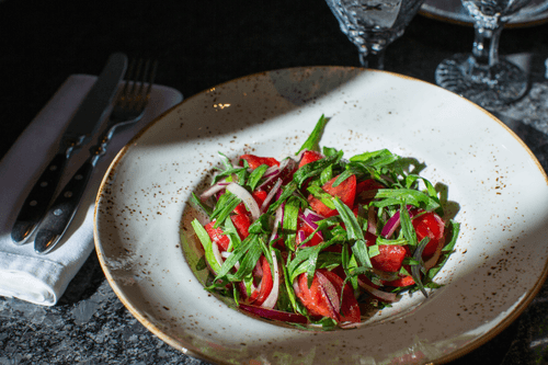 An ideal, simple salad that will be made if you find sweet and aromatic tomatoes. Recipe from the restaurant "Height 5642".
