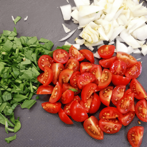 Chop sorrel, cabbage, and cherry tomatoes coarsely.