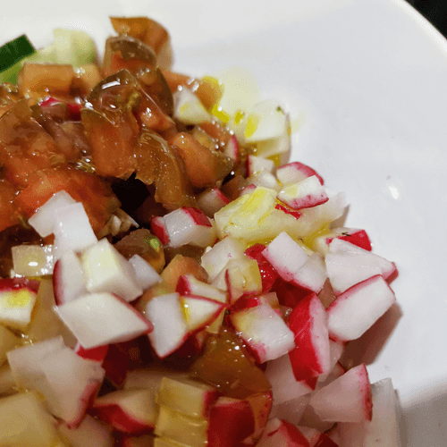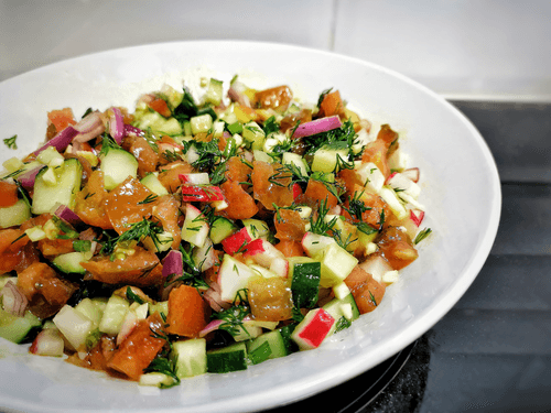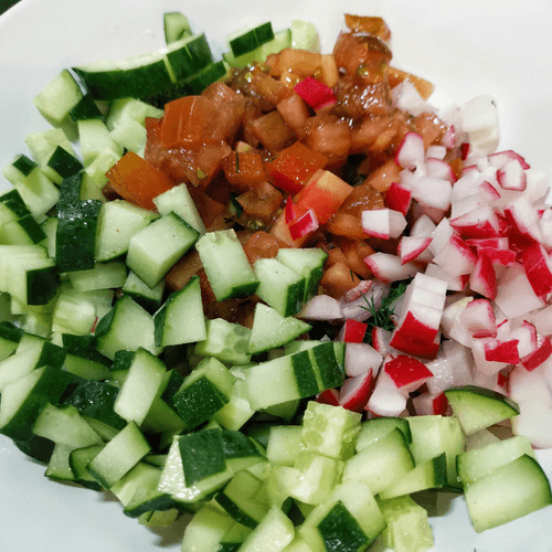 Kuban vegetable salad with garlic is a bright and aromatic dish reflecting the traditions of Russian cuisine. Its roots go back to the fertile lands of Kuban, where fresh vegetables have always been a staple. This salad combines juicy tomatoes, crunchy cucumbers, spicy radishes, and the rich flavor of garlic, creating a harmonious balance of freshness and spiciness. Dressed with mustard oil, it gains a subtle sharpness and pleasant aroma. The Kuban salad perfectly complements meat and fish dishes and can also serve as a light snack on its own. It is easy to prepare but has a rich taste that is especially good in summer when vegetables reach their peak ripeness.