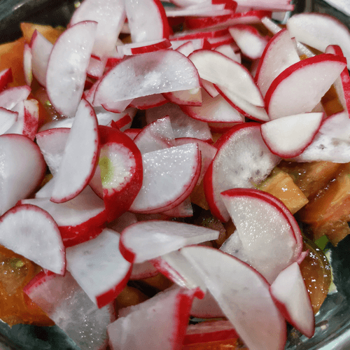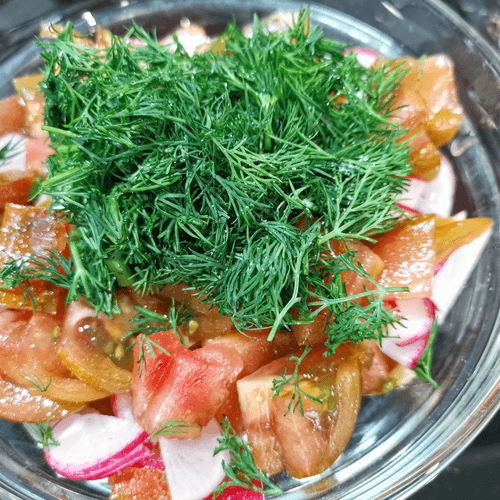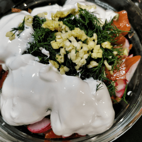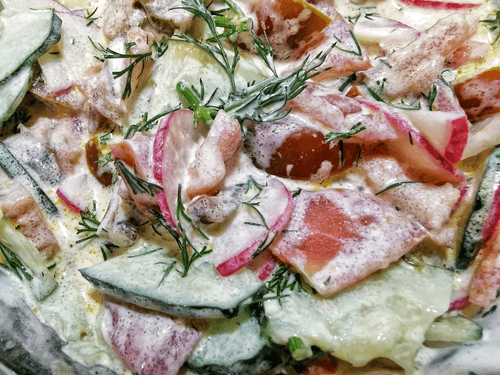 Hearty village salad with sour cream embodies the simplicity and freshness of Russian cuisine. Its roots trace back to traditional village feasts where garden vegetables come together in harmonious flavor. Crunchy cucumbers, juicy tomatoes, and spicy radishes create a vibrant palette of textures, while aromatic dill and garlic add richness to the dish. A bold sour cream dressing makes the salad tender and balanced, highlighting the natural flavors of the vegetables. It is perfect as a standalone dish on a hot summer day or as a refreshing side to meat and fish dishes. This is a true ode to Russian culinary tradition — simple, tasty, and nutritious.