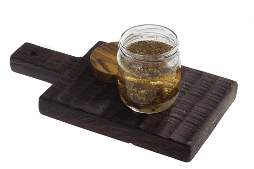 Pour vegetable oil, vinegar, dried herbs into a jar with a screw cap, add dried chili, black pepper, and salt.