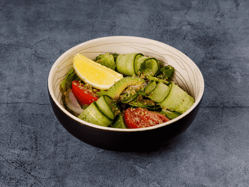 Place a mix of salad, onion, avocado, and tomatoes on a plate, garnished with cucumber slices.