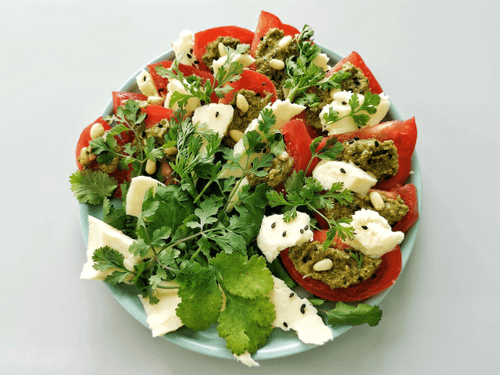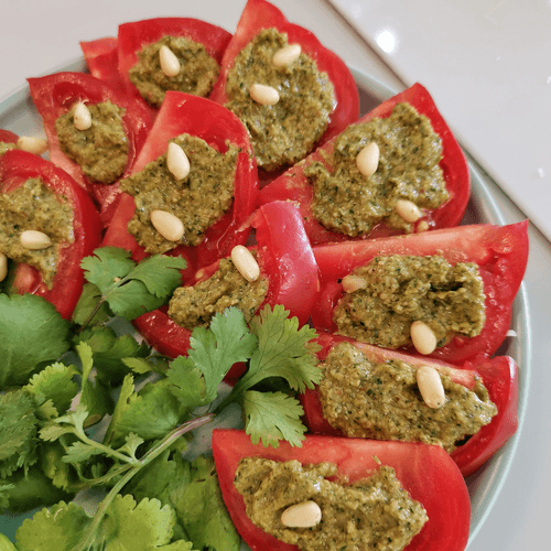Coat the tomatoes with pesto sauce and sprinkle with pine nuts.