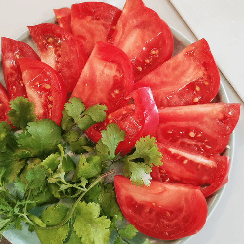 Cut the tomatoes into wedges and place them on a plate with cilantro.