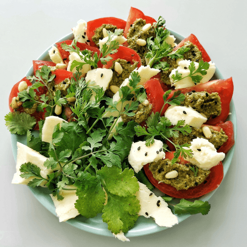 Этот изысканный микс из свежих овощей с сыром сулугуни – воплощение легкости и гармонии армянской кухни. Тонкие ломтики сочных помидоров, дополненные свежей кинзой, создают освежающий вкус, который дополняет пикантный аромат песто. Сыр сулугуни придаёт блюду нежную сливочность, а кедровые орешки и кунжут добавляют приятную текстуру и ореховые ноты. Такое сочетание делает салат не только прекрасным дополнением к основным блюдам, но и отличным самостоятельным угощением. Идеально подходит для лёгкого обеда или праздничного застолья, раскрывая богатство вкусовых оттенков. Подаётся при комнатной температуре, чтобы сохранить всю свежесть ингредиентов и подчеркнуть их натуральную насыщенность.