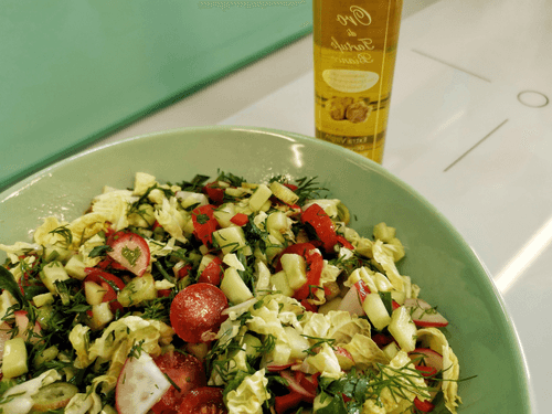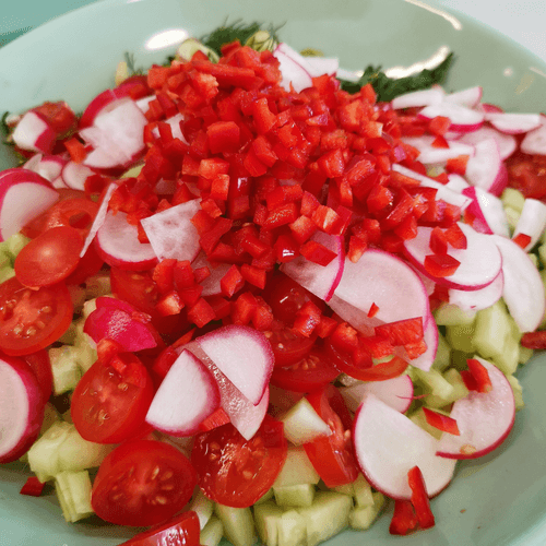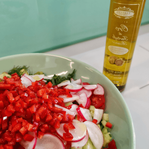 Vegetable salad with truffle oil is the embodiment of elegance and freshness of European cuisine. Its roots trace back to the traditions of Mediterranean culinary art, where natural ingredients fully reveal their flavors. The lightness of napa cabbage and greens harmoniously combines with crunchy vegetables: cucumbers, radishes, and ramiro peppers, while the sweetness of cherry tomatoes adds balance. The subtle aroma of truffle oil transforms this salad into a gastronomic delight, giving it a unique sophistication. This salad is perfect as a light appetizer before the main course or as a fresh side dish for fish and meat. Its taste is a play of textures and aromas that leaves a pleasant aftertaste and highlights the natural richness of the ingredients.
