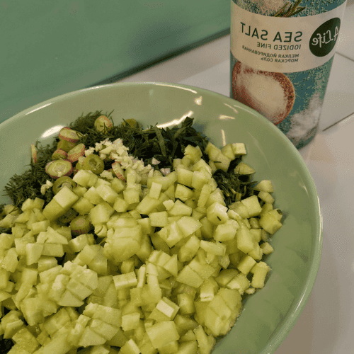Peel the cucumbers, chop them finely. Chop the garlic finely as well. Add salt.